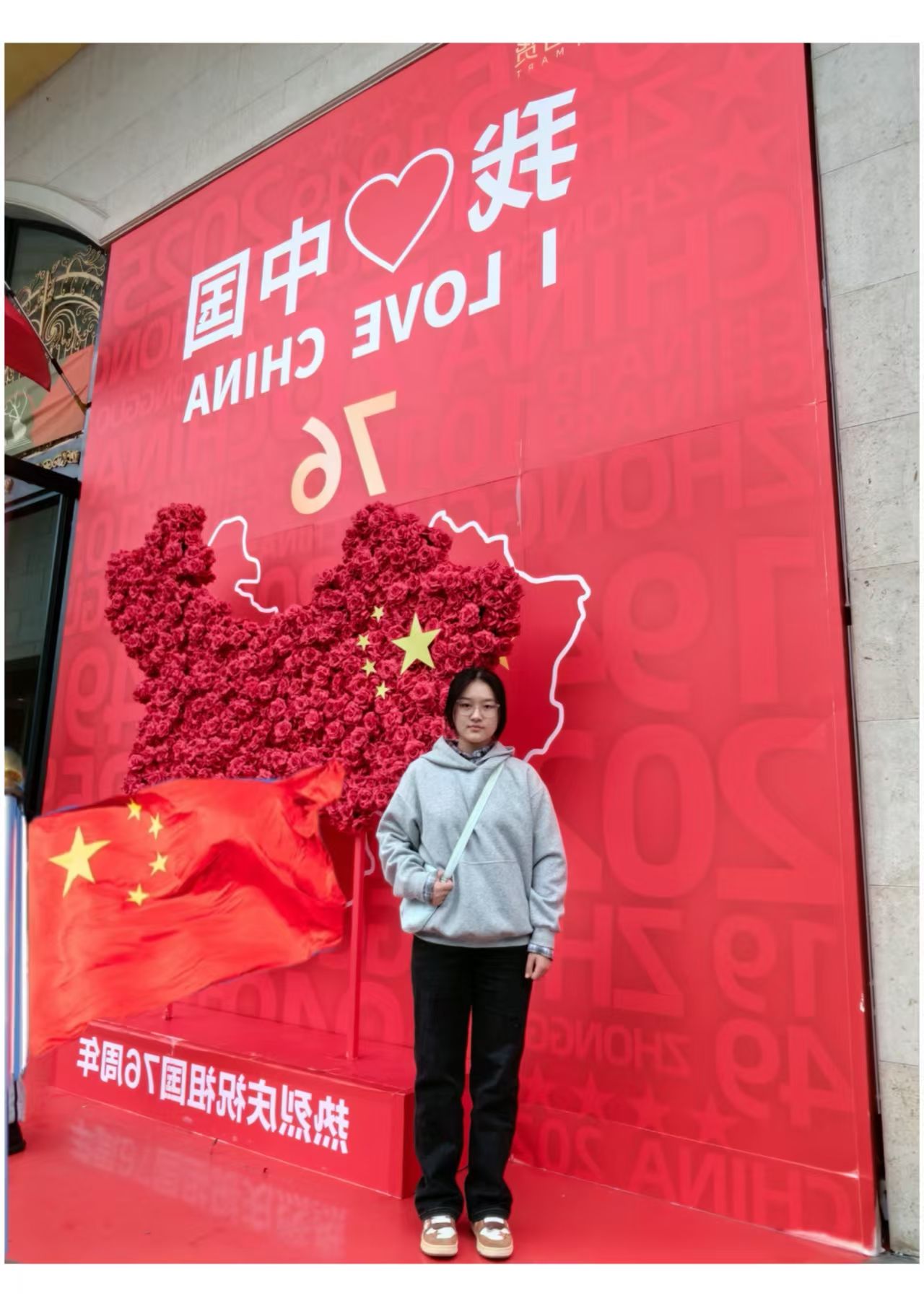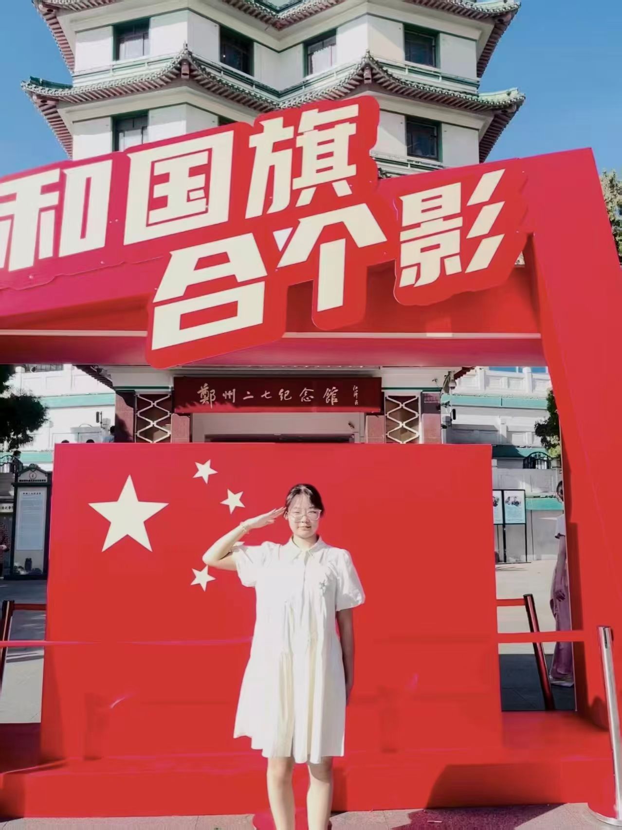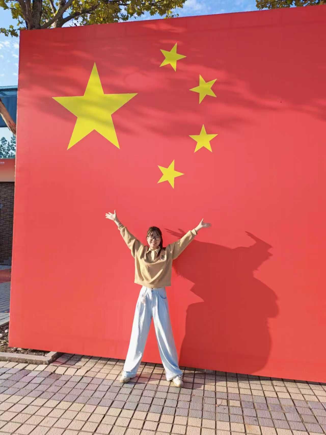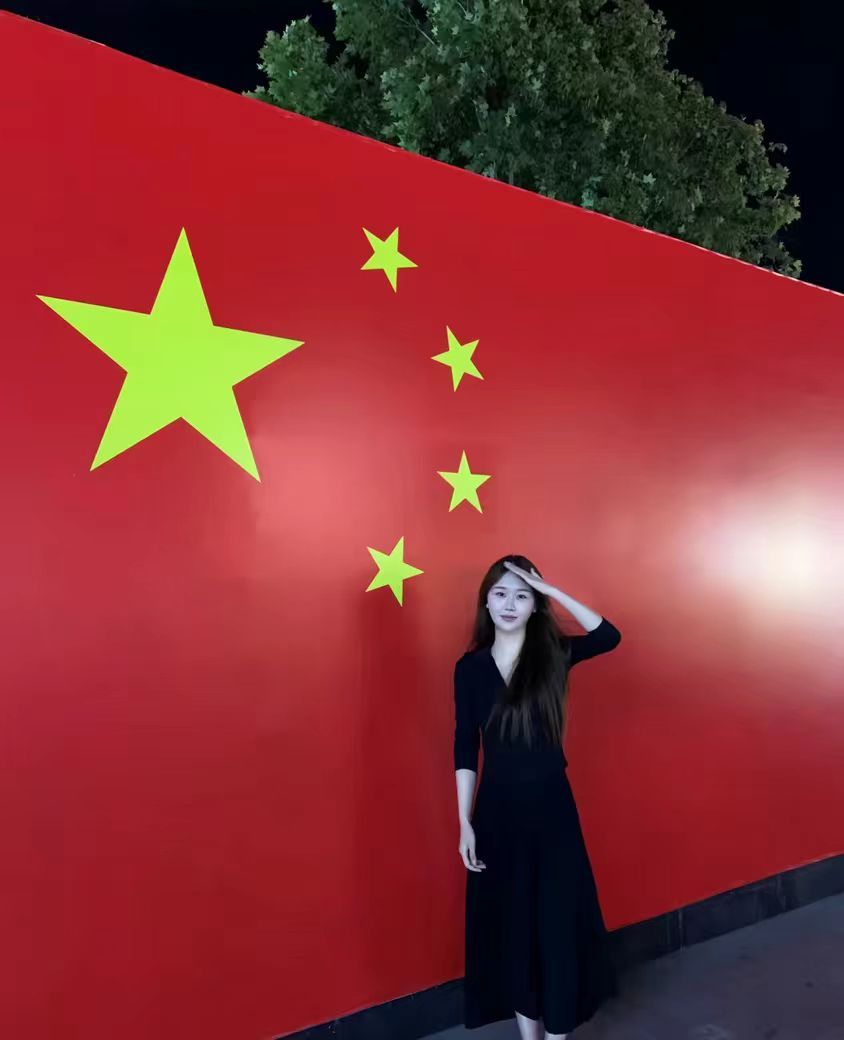 活动期间,同学们围绕 “与国旗或红色建筑合影” 的核心要求,充分发挥创意,在校园标志性场景、城市红色地标与特色街巷间寻找灵感:有的在学校餐厅前与国旗并肩而立,用烟火气中的庄重,展现学子求知报国的坚定;有的手持国旗伫立在二七塔前,以红色地标为证,让信仰的色彩与革命记忆深情呼应,传递对先辈精神的传承;还有的奔赴著名红色景点,在历史印记与红色氛围间与国旗同框,让青年理想与家国情怀在镜头下交融生辉;亦有同学身着浅色连衣裙,在挂满国旗的街道上微笑比 “耶”,古朴骑楼与鲜艳国旗相映,用青春姿态传递对国家的热爱与自信。每张照片背后,或阐述场景选择的意义 —— 如骑楼街巷的场景象征传统与现代融合,凸显青年传承文化、建设国家的担当;或分享个人对爱国精神的理解,字里行间满是 “五星闪耀皆为信仰” 的赤诚,彰显新时代青年与祖国同频共振的初心。