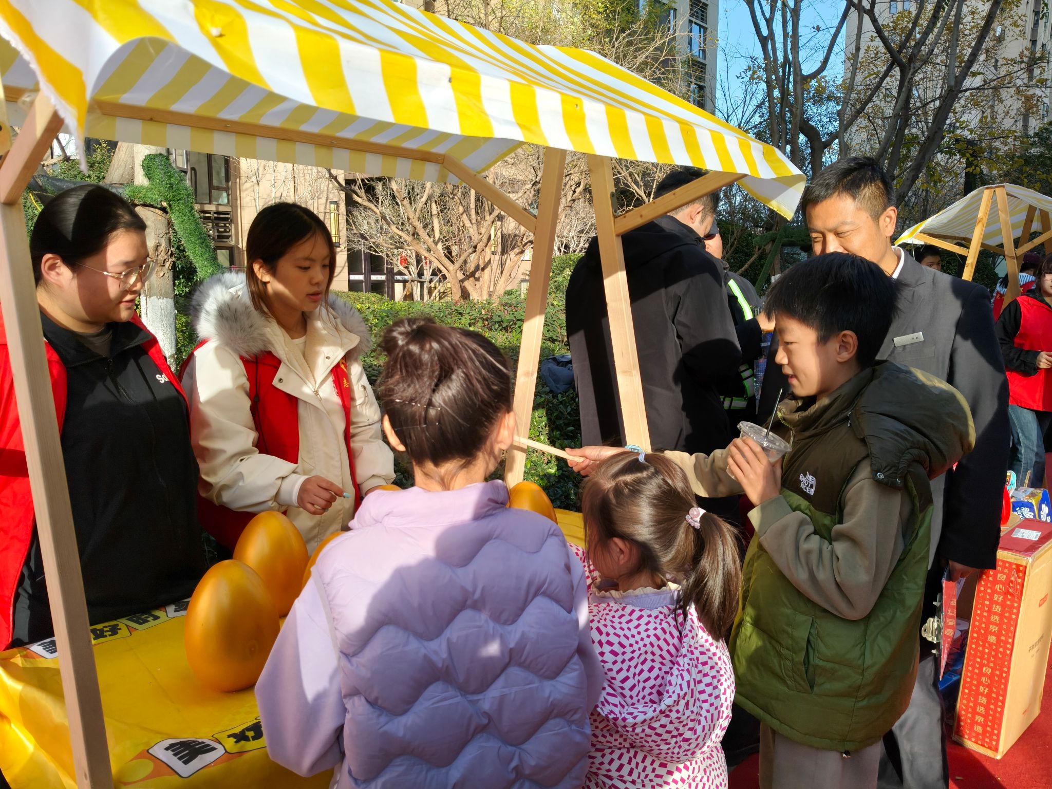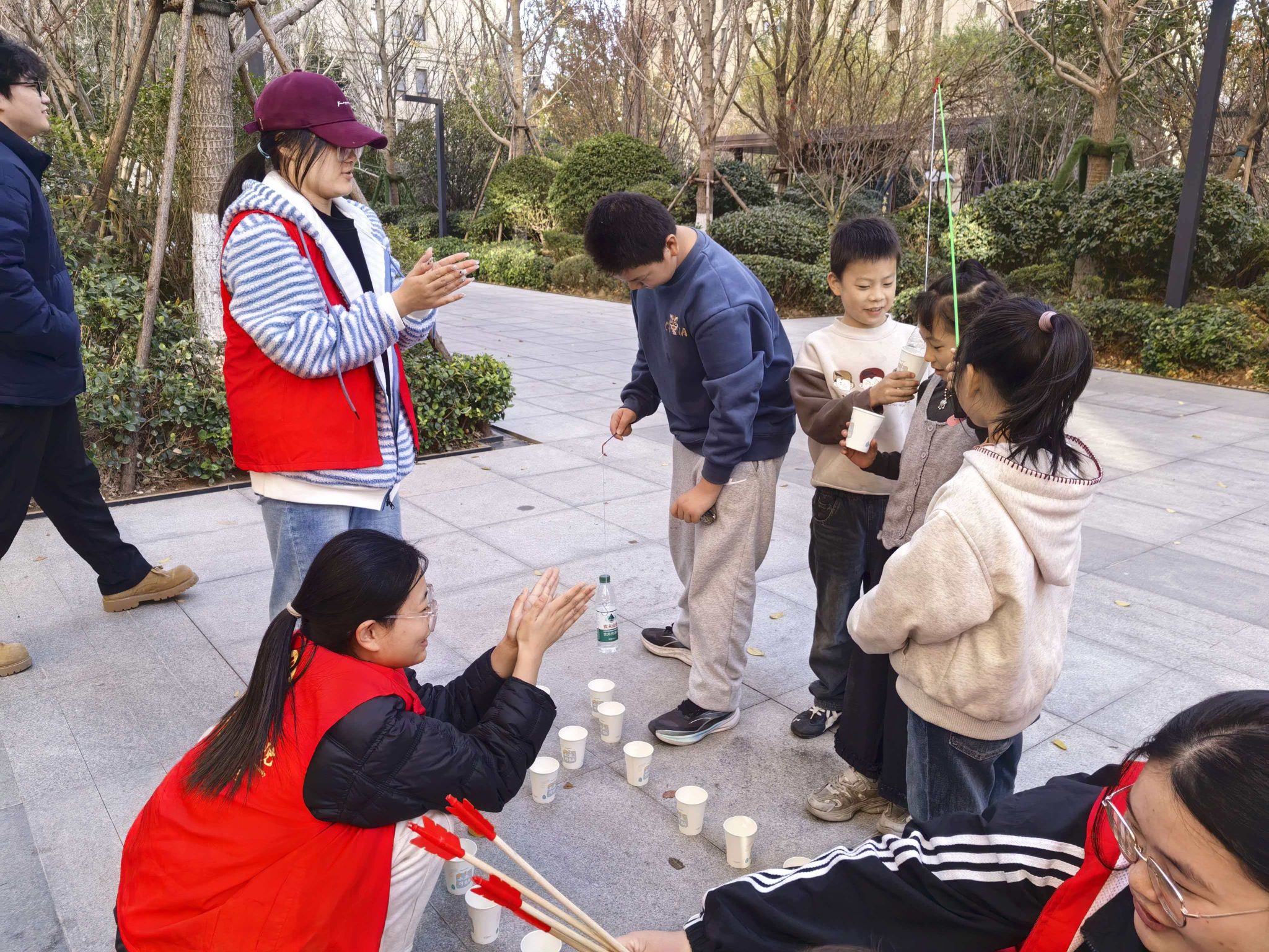活动现场热闹非凡,,居民们携老扶幼早早到场,欢声笑语此起彼伏。志愿者们提前搭建好游戏区,精心设计了钓纸鱼、投壶、套圈等适合全年龄段参与的互动项目——小朋友们围在钓纸鱼摊位前,手持鱼竿专注瞄准,钓起“鱼儿”时的欢呼声不断;长辈们则在投壶区跃跃欲试,拿起箭矢回忆儿时乐趣,偶尔失误的调侃让现场气氛愈发轻松。更引人注目的是,两名志愿者身着憨态可掬的玩偶服穿梭在人群中,主动与小朋友击掌、合影,还帮行动不便的老人搬来座椅,成为现场最暖心的“移动风景线”。“平时孩子难得和这么多小伙伴一起玩,志愿者们特别有耐心,这样的活动太有意义了!”参与活动的李女士笑着说;刚完成投壶挑战的王爷爷也点赞:“不仅能玩游戏,还认识了隔壁邻居,感觉小区更有人情味了。”