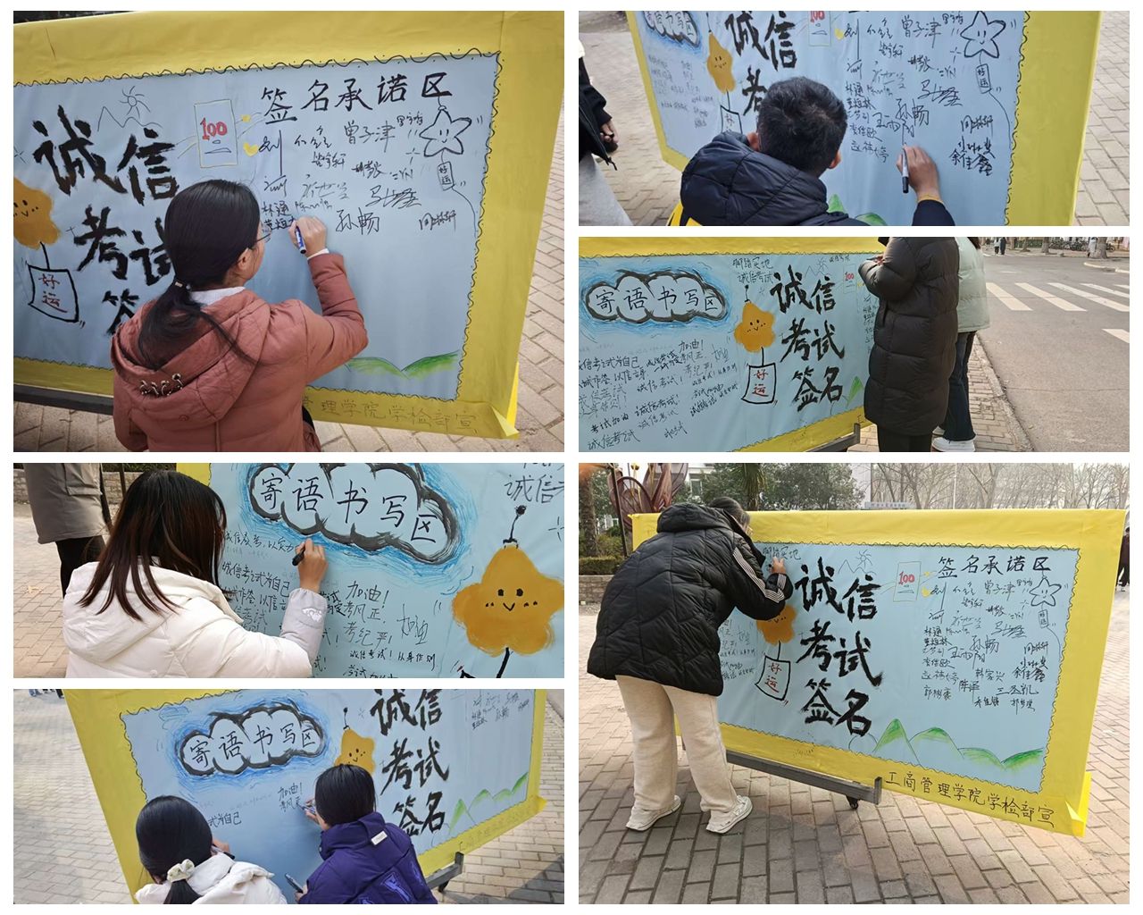 活动现场设置了诚信考试主题签名展板,分为“诚信寄语”书写区和“承诺签名”区。同学们积极参与,认真书写对诚信考试的认识与承诺,并郑重签下自己的名字,表达恪守考纪、诚信应考的坚定决心。活动过程井然有序,氛围庄重。