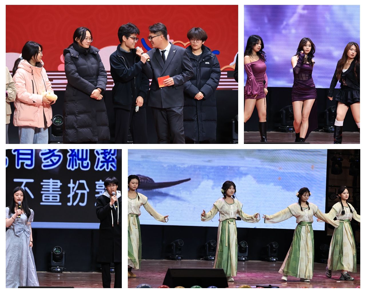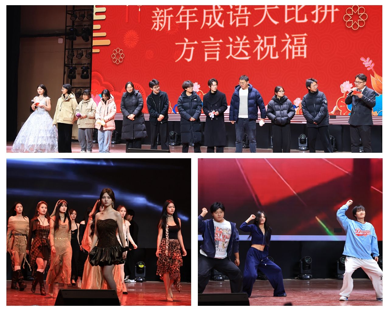 民舞队表演的《小城谣》婉约柔美,展现传统韵味;校礼仪队的走秀《Desert Hush》步伐自信,气质非凡,将晚会推向又一个高潮。晚会中还穿插了“成语大比拼”、“击鼓传花”等互动环节,师生同乐,现场欢声笑语不断,气氛热烈。