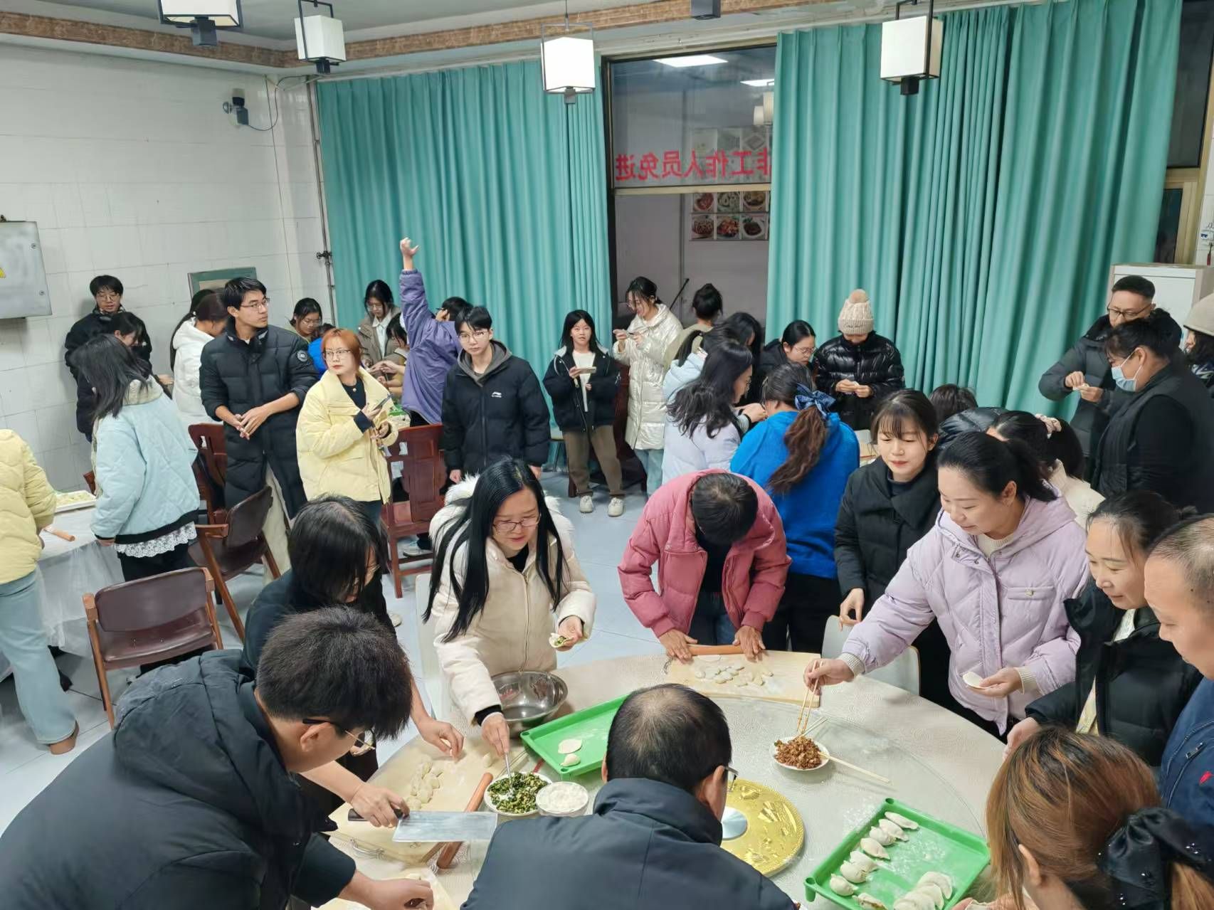 活动开始前,餐厅员工们早早的为师生准备好了包饺子用的馅料、面皮和工具。室外寒风凛冽,室内暖意融融。活动伊始,学院工会主席、学院党委王国辉书记首先为大家普及了节气知识,让大家再次感受中国传统文化的魅力。紧接着就到了师生们大显身手的时间,铺桌子的铺桌子、和馅的和馅、揉面的揉面,不一会儿浓香扑鼻的馅料,柔软白糯的面团就呈现在大家面前,包饺子不仅是一项“技术活”,更需要团结协作。活动中,大家纷纷拿出看家本领,聊着家常,欢快地擀皮,只见轻轻一攥,胖胖的饺子便整整齐齐的排好了队,不一会的功夫,皮薄馅大的饺子便摆满了整个桌子。大家在欢乐、温馨的气氛中大显身手,每个人的脸上都洋溢着灿烂的笑容。在欢声笑语中,师生们分享着包饺子的技巧和心得,互相交流着生活趣事,场面温馨而祥和,在WilliamHill中文分工会这个大家庭中,饺子似乎更有了一股“家”的味道。