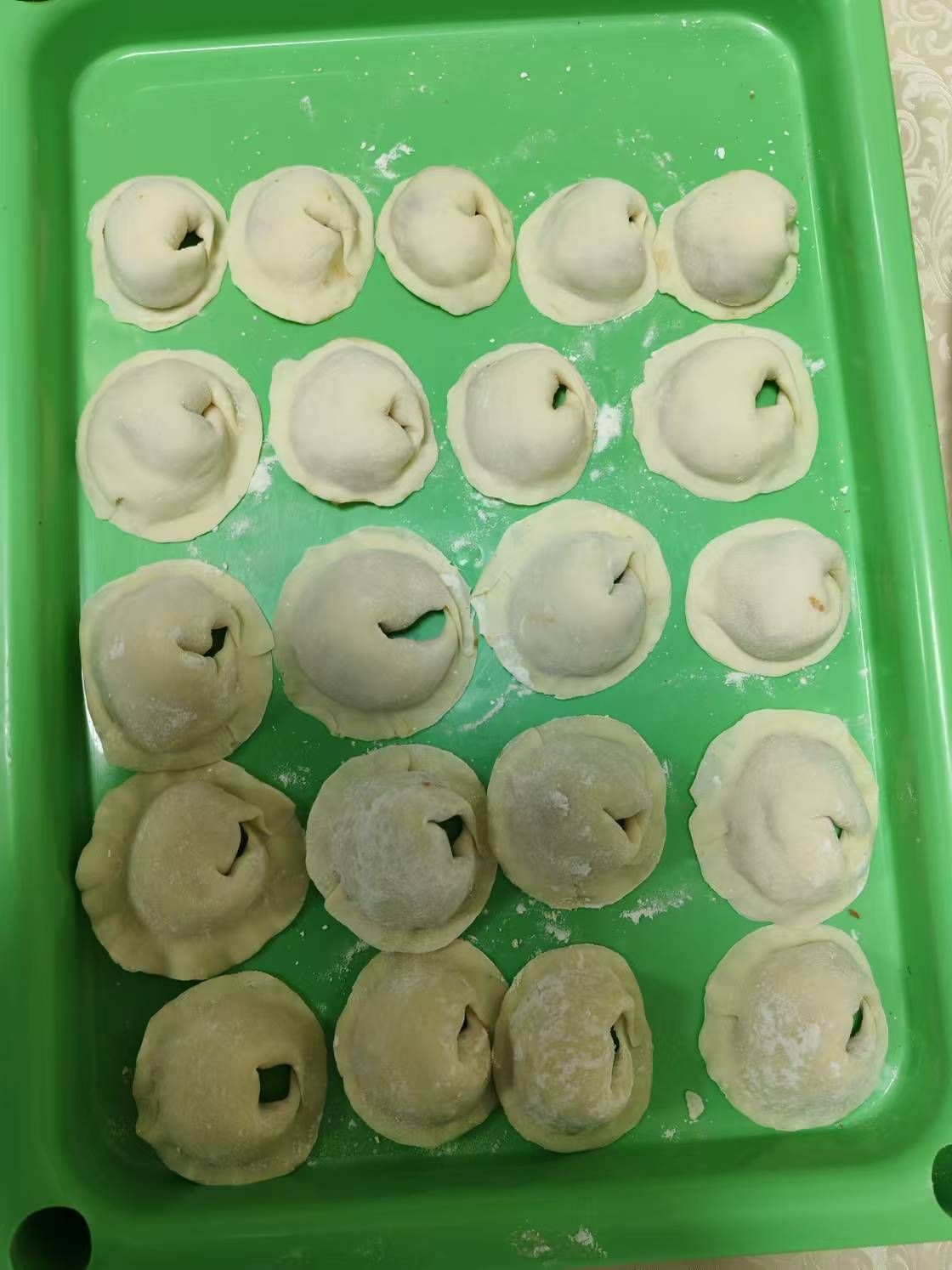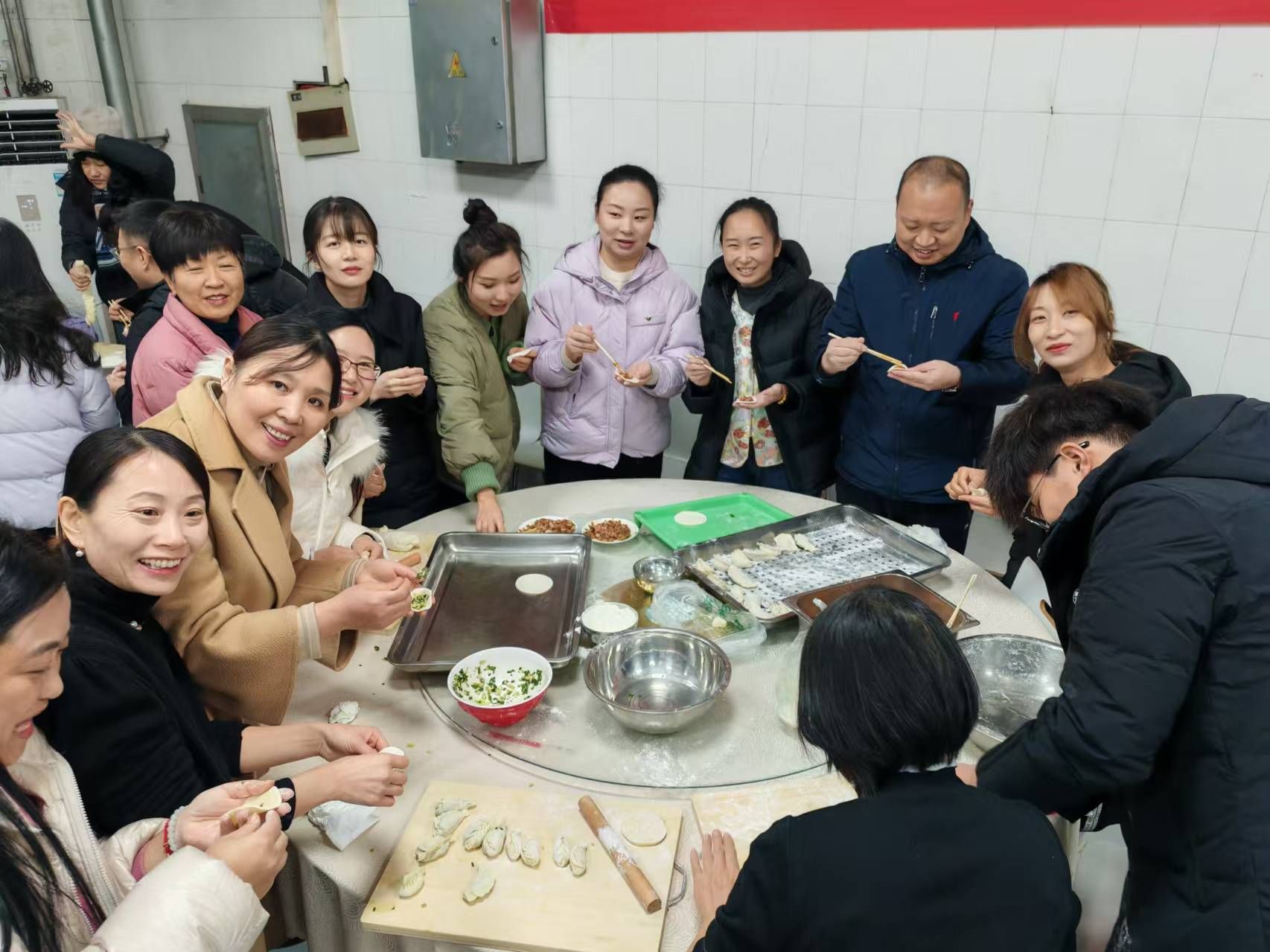 一个个紧实饱满的饺子在大家的共同努力下诞生了,一盘盘凝聚着美好祝愿的饺子陆续下锅,伴随着一番幸福的忙碌,一份份热气腾腾、香气四溢的饺子在大家的期待中端上了桌,这一刻好像隔绝了冬日的寒冷,到处充满了温暖祥和的气息。有奖饺子的逐个出现,更是让大家热情激昂,笑声不绝!