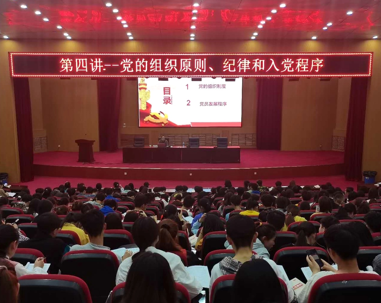 党课伊始,王国辉副书记开门见山,概括了本次培训的内容:党的组织制度和党员发展程序,让每位入党积极分子对党有了更加清晰深刻的认识。接着,王书记就中国共产党的组织制度讲述了民主集中制的形成和发展、基本含义、六个基本原则和需要注意的问题,并且要求入党积极分子认真学习党的纪律,规范自身行为,做一名合格的中国共产党党员。随后,王书记结合自身工作经验从党的十八个程序、入党的五种身份转变、三个关键点、新十六字方针对党的发展程序进行详细讲解,并结合各个阶段的党员发展要求,为大家细致地讲解了党员发展各阶段的材料准备、成为党员的程序和条件、党员的接收和审批流程,以及成为正式党员后的要求。王书记强调了发展党员工作的重要性,并鼓励同学们认真学习本课,规范自身入党程序。最后,王国辉书记希望各位积极分子能够不忘初心、牢记使命,为中华民族伟大复兴不懈努力!