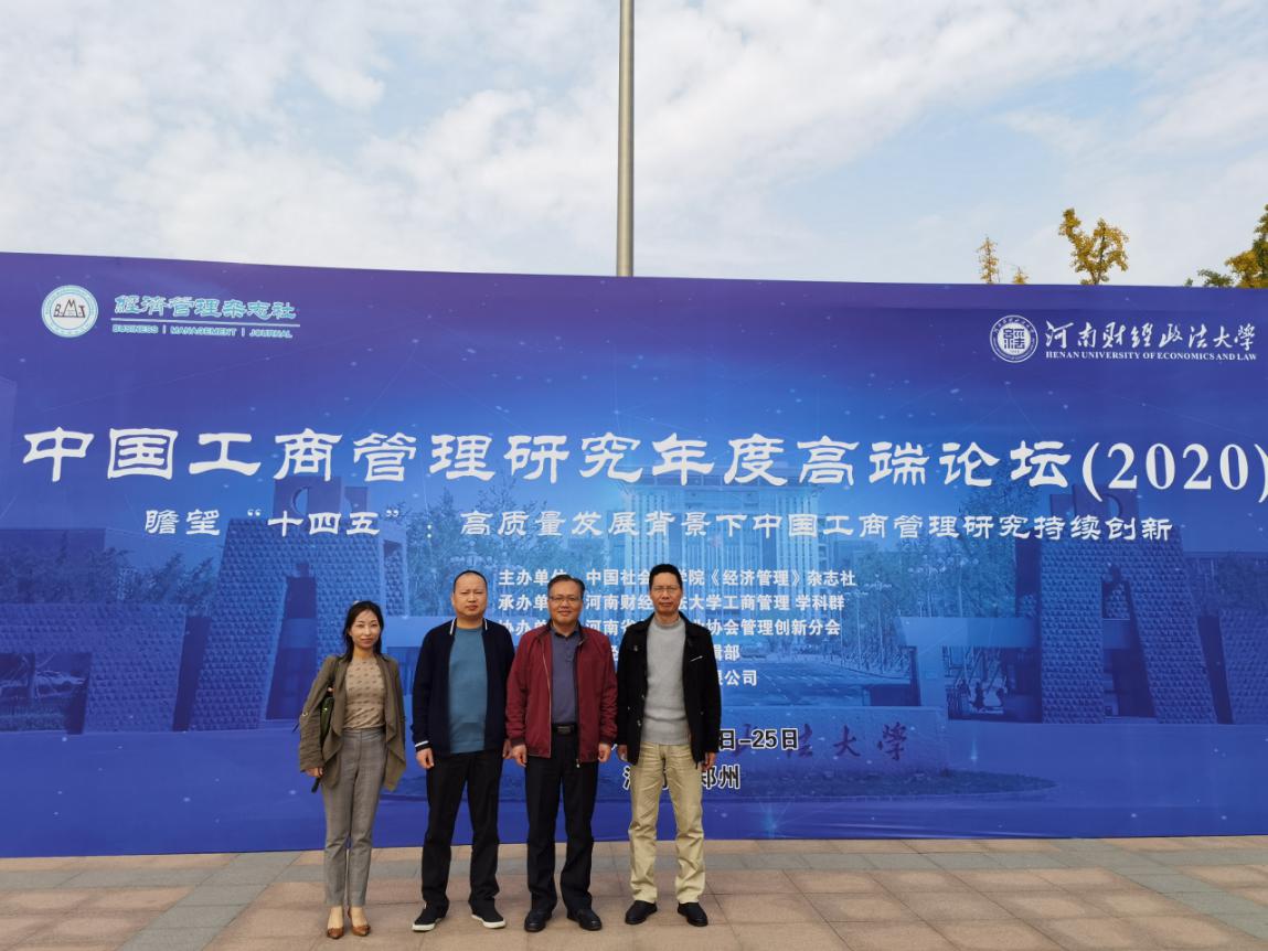 WilliamHill中文王筝院长、范森副院长、陈科博士、吕梦博士一行4人参加了2020年10月24日-25日在河南财政政法大学召开的中国工商管理研究年度高端论坛(2020),本次高端论坛主题为“瞻望‘十四五':高质量发展背景下中国工商管理研究持续创新”,分论坛设置了战略与组织管理、会计与公司财务、市场营销与电子商务、旅游与疫情下区域高质量发展等四个主题,旨在针对中国工商管理现存问题,探寻中国工商管理研究的规律和路径,促进国内工商管理学术界的互动与合作,稳健、踏实、持续提升国内工商管理一级学科办学的水平。
