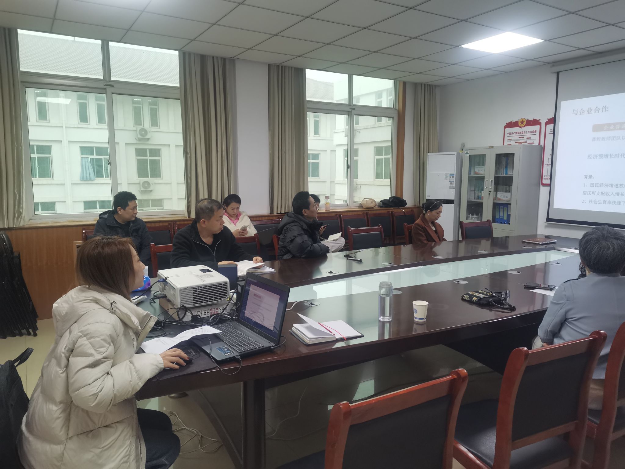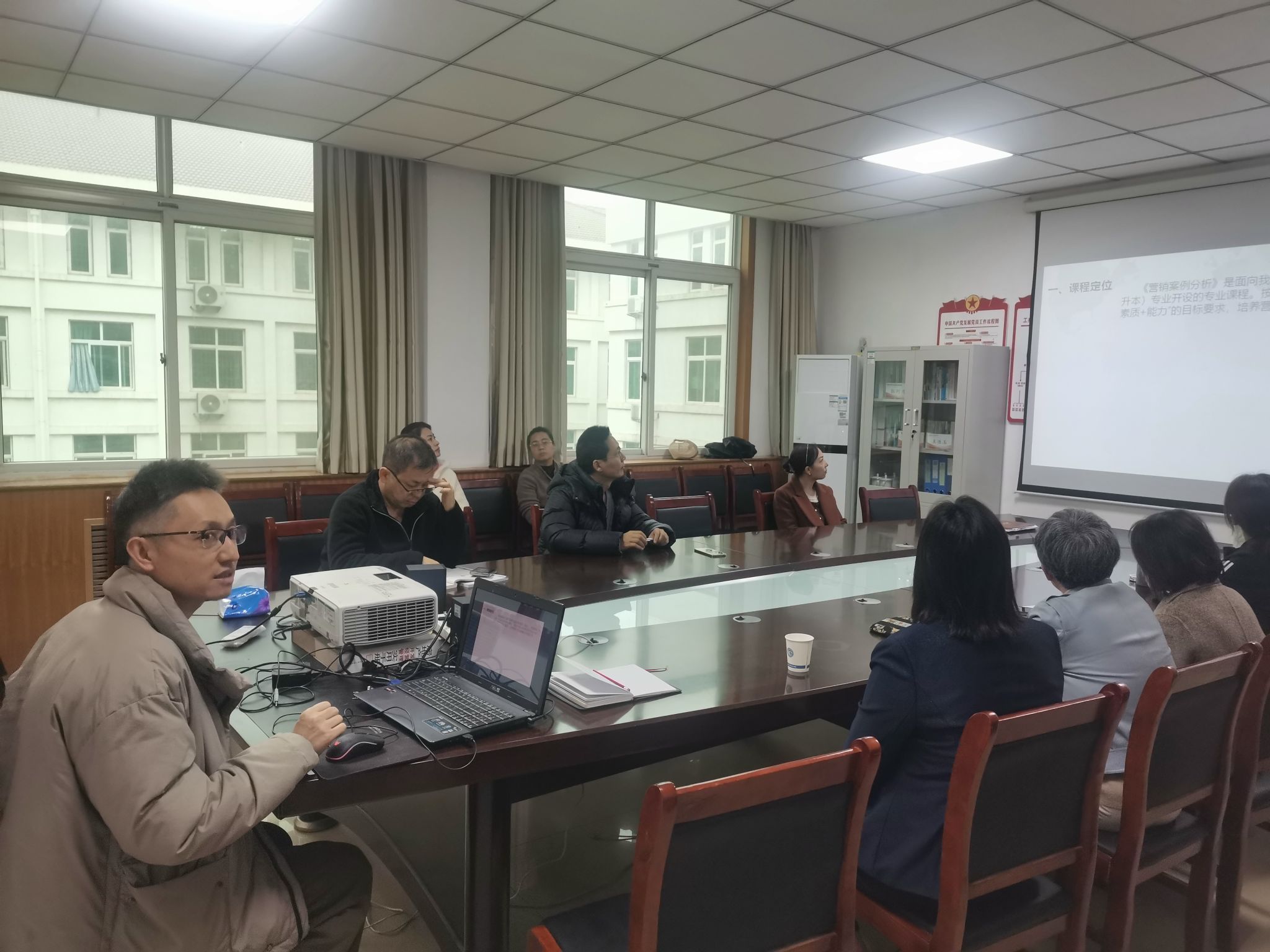 接着《营销案例分析》课程主持人张长浩、《新媒体营销策划》主持人武钰敏、《绩效管理》主持人刘哲、《现代企业管理学》主持人吕梦、《工程项目管理》主持人程锡麟,依次从课程建设目标完成情况、取得的建设成果、课程建设中存在的问题、改进措施等方面开展了汇报。