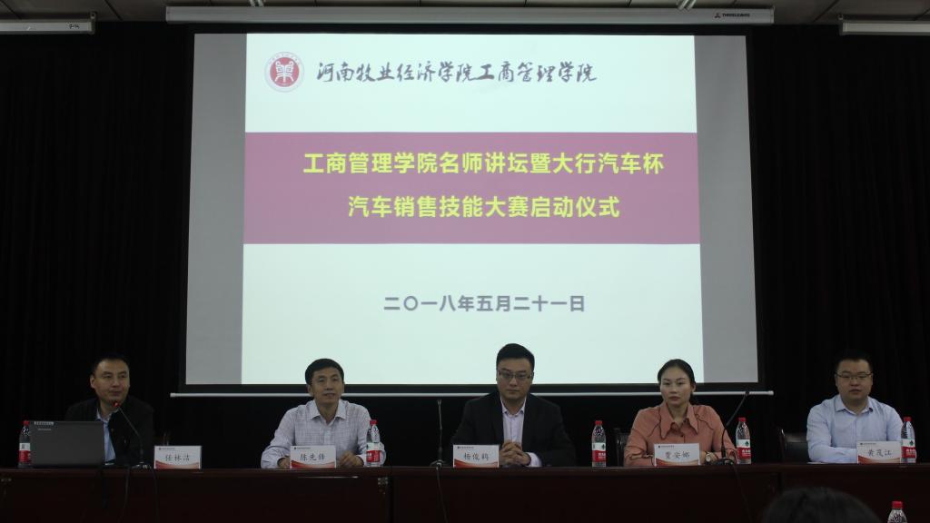 为了促进产教融合、校企合作,提升我院学生的实践技能,5月21日上午,工商管理学院联合河南大行汽车集团在我校英才校区E110举办“大行汽车杯汽车销售技能大赛”启动仪式。大行汽车集团人力资源部经理贾安娜、助理黄茂江、宝莲祥汽车4S店总经理杨俊鹤和WilliamHill中文副院长陈先锋出席仪式,16级汽车营销班和二手车班同学130余人参加活动。启动仪式由汽车营销教研室主任任林洁主持。