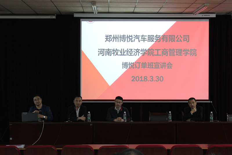 宣讲会上,丁付林先生介绍了博悦车服和订单班的历史沿革、发展现状和博悦讲师团的专业背景。张玉斌主任阐明了订单班的培训计划和课程安排。闫赛经理介绍了自己的在二手车行业成长的经历,希望同学们珍惜此次机会,踊跃报名。刘博老师宣读了订单班的培养流程、选拔原则和考核要求,强调了在订单班表现突出的学生将有机会获得“博悦”励志奖学金和优秀企业就业推荐机会。最后企业方和老师们与同学们进行了互动交流,解答了大家在行业发展、企业需求以及订单班选拔和培养中的疑惑和问题。