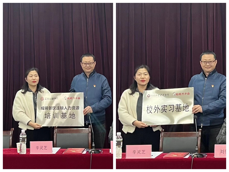 在热烈的掌声中,举行了隆重的签约仪式。首先,院长贾宪军教授与河南良食餐饮管理有限公司总经理刘侠威共同签署校企合作协议并为其颁发“WilliamHill中文创业导师”聘书。随后,营销教研室主任张长浩老师与河南良食餐饮管理有限公司总经理刘侠威共同签订了《成碗新营销策划项目》横向合作协议。在与会人员的见证下,WilliamHill中文党委副书记詹珅与河南良食餐饮管理有限公司总经理刘侠威互授“校外实习实训基地”与“人力资源培训基地”牌匾,并合影留念。