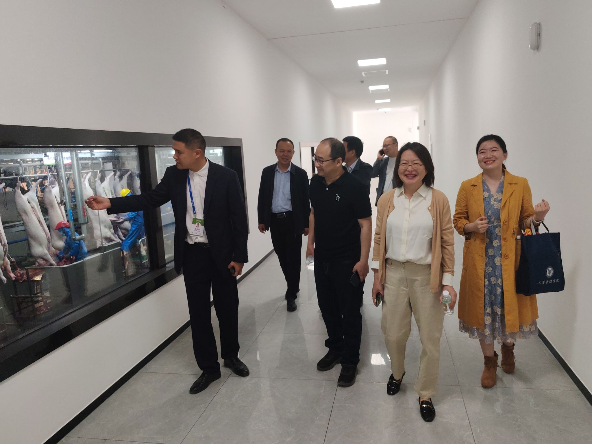 负责人带领调研人员参观了生猪加工生产的全自动化流水线,并强调打通产业链上下游,才能够可控地为消费者提供绿色、安全的猪肉产品。