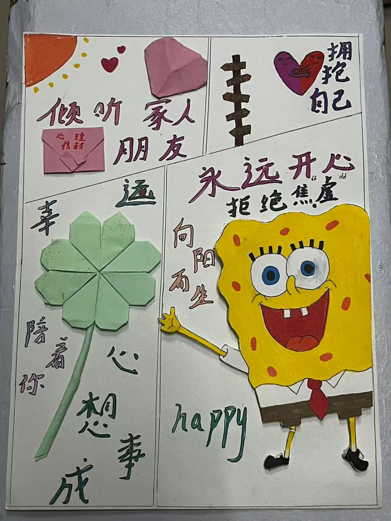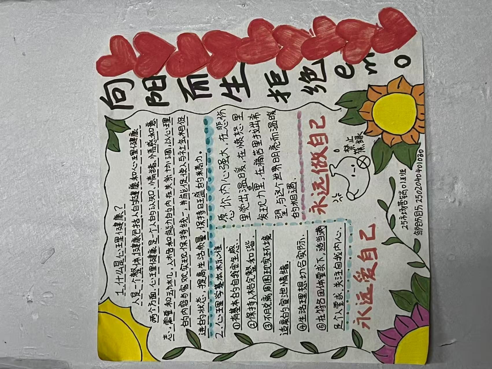 活动期间,近百名参与者通过手工创作、纽扣拼画、剪纸折纸等创作,在实践中释放压力、治愈情绪,收获满满的温暖与力量。创作环节中,参与者们独立构思,有的用纸张制作出“微笑的太阳”与“绽放的花朵”,象征对积极生活的向往;有的用纽扣拼贴出“携手同行的小人”,传递陪伴与支持的力量;还有的用便签裁剪出“希望之花”,寄托对未来的美好期许。此次活动不仅让同学们更加深入了解心理健康文化知识,更激发了大家对校园生活的热爱与期待。