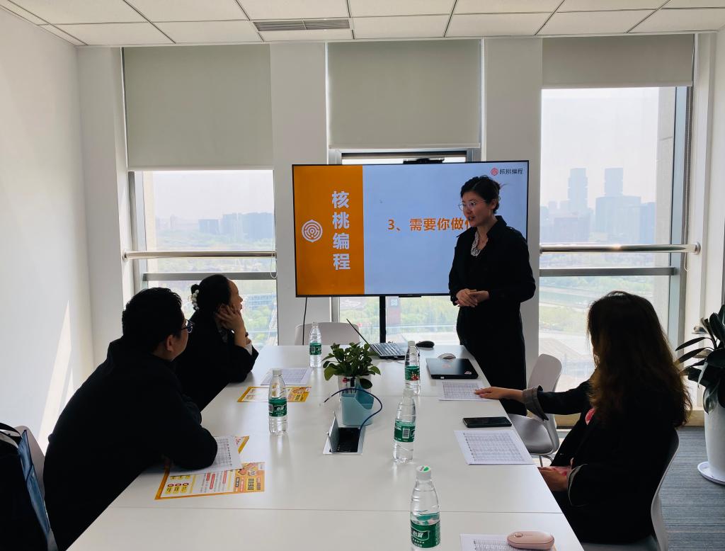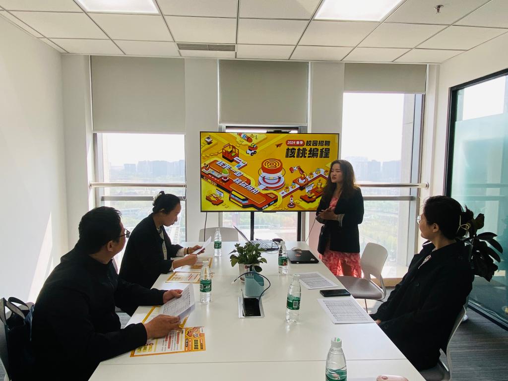 核桃编程全国校招负责人陈柳廷、郑州课程导师校招侯瑞娇在开场致辞中对我院一行人的到来表示了热烈欢迎,也欢迎更多优秀的同学到核桃编程实习、就业。座谈中,两位负责人详细介绍了公司发展历程、主营业务、晋升通道、实习实训等基本情况。她们表示核桃教育作为有上市公司背景支持,股东实力较为雄厚的企业,公司的营销模式和人才培养理念非常契合我院的相关专业,并期许能以本次访企拓岗为契机,加强沟通合作,为后期建立实习实训基地的可行性和双方强化产学研合作做好基础。