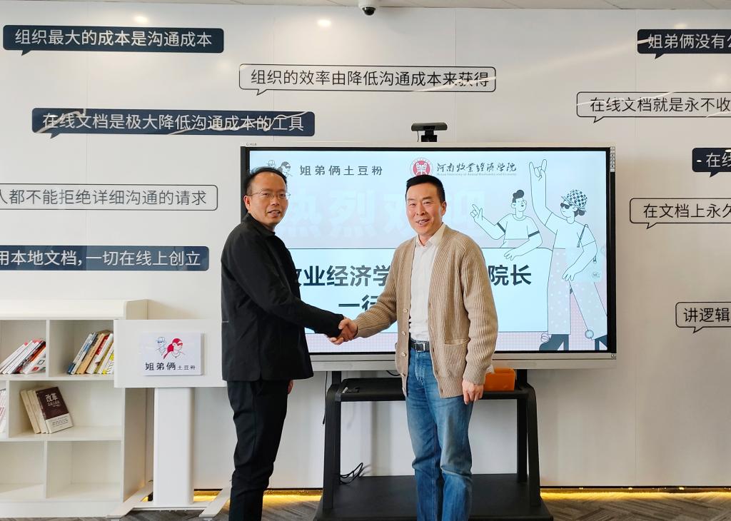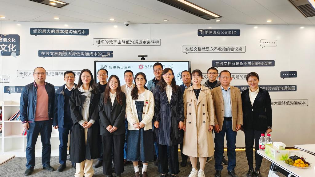 姐弟俩品牌创始人宋宝民董事长向贾宪军院长一行介绍了公司的经营理念、独特的复盘文化和带兵育人管理模式,详细展示了姐弟俩近年来在数字化管理转型方面的成功探索。宋宝民董事长强调,创始人创业要勇于选择差异化,只有沉下心、稳得住,才可能成就百年品牌的梦想;青年学生渴望成功,但一定要有正确的职业观,其中乐观的心态、坚韧的性格和隐忍的毅力必不可少。座谈交流中,姐弟餐饮管理有限公司总经理冯太祥介绍了公司的发展历程和发展战略规划,人力资源部经理卞伟民和人事教练刘丹分别对公司的人才培养体系、人才需求与发展计划等进行了详细的介绍,我院三位优秀毕业生代表也分别汇报了各自在姐弟餐饮管理有限公司工作的收获和体会。