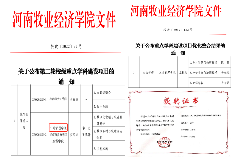 学科领先,专业一流。市场营销专业为学校最早开设的本科专业,是河南省一流专业,物业管理专业是河南省特色专业,工商管理专业是综合示范专业,大数据管理与应用专业是教育部特设专业。“企业管理”和“数字化管理工程”是校级重点学科、“数字化营销”和“人才发展与管理”是院级重点培育学科。《管理学》《市场营销学》《人力资源管理》《组织行为学》为省级质量工程项目。现有一个省级社科重点研究基地——“乡村振兴与农产品品牌建设”和一个郑州市哲学社会科学研究基地——“人才与人力资源发展研究中心”。与河南省社科联合作打造了“河南发展高层论坛”学术平台,近年来承担30多项国家级、省部级课题,获得省部级科研成果奖10余项。